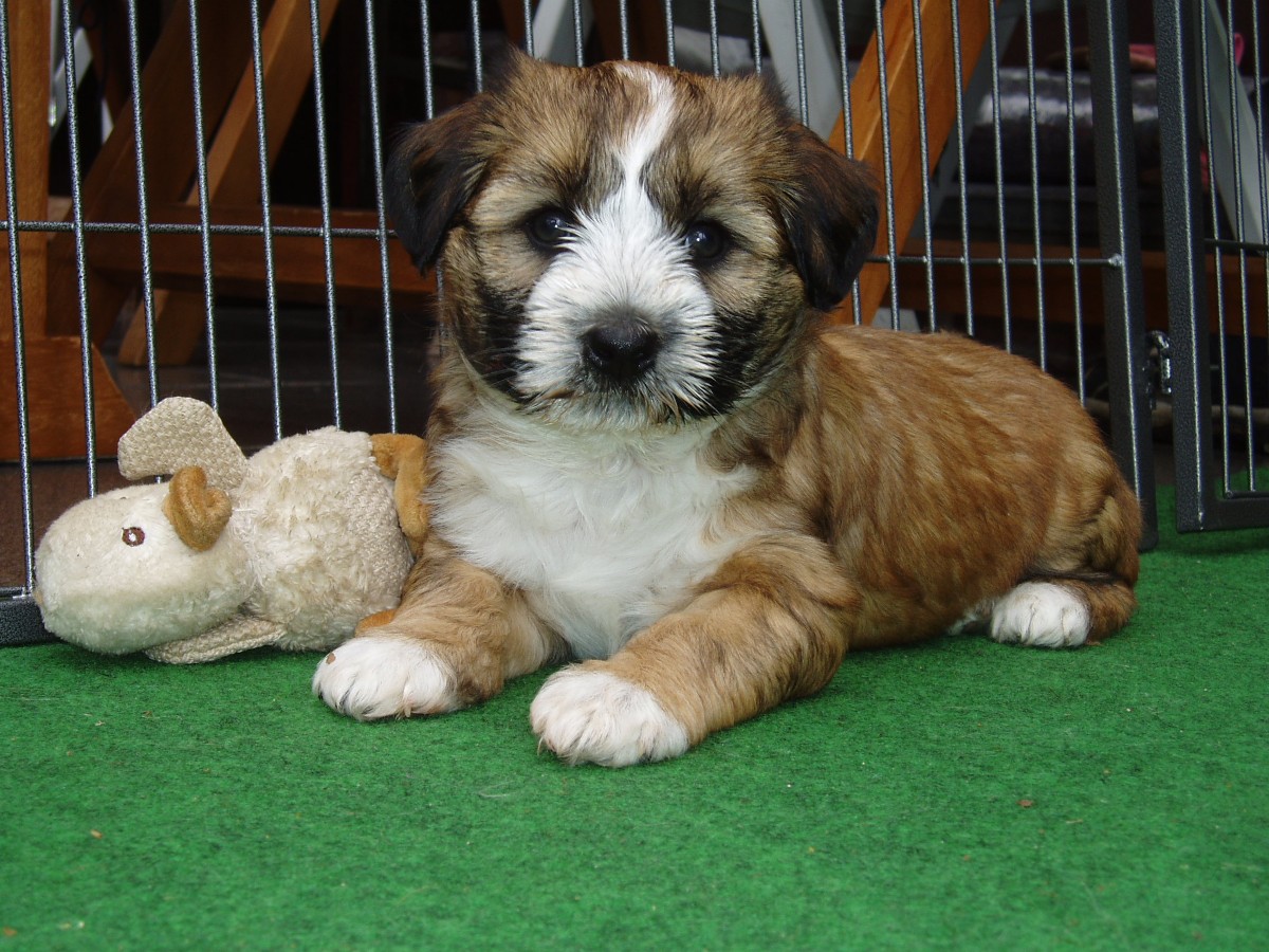 02.06.2012 Die Welpen sind nun gut 4 Wochen alt. Die Zeiten, in denen hauptsächlich geschlafen und gegessen wurde, sind vorbei. Ihr Taten- und Entdeckerdrang nimmt täglich zu. Aus kurzen Spielmomenten entwickelten sich innerhalb von ein paar Tagen richtige Tobe-Runden, die auch gerne in kleinere Rangeleien übergehen. Wenn es zu wild wird, greift Mama Shari liebevoll aber bestimmt ein und beginnt mit einer gründlichen Säuberung ihrer 4 Racker. Am Mittwoch hatten wir Besuch von Sharis Züchterin Beate Beckmann-Kruczek. Die Welpen waren zum ersten Mal im Welpen-Gehege im Wintergarten und Beate startete eine richtige Fotosession. Einige der gelungenen Schnappschüsse sind hier zu sehen. A-jo spielt mit einem Stoffhund. "Hallo Leute, ich bin Amdo! Na, Beate, mach doch bitte noch ein Foto von mir!" So schnell ist A-sa-ra noch nicht müde! A-mra legt eine kleine Pause ein. A-mra im Welpen-Gehege.